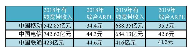 2019年,在提速降費(fèi)以及中國(guó)移動(dòng)低價(jià)套餐沖擊下,中國(guó)電信與中國(guó)聯(lián)通有線寬帶綜合ARPU有所下降,但也高出中國(guó)移動(dòng)7元左右。