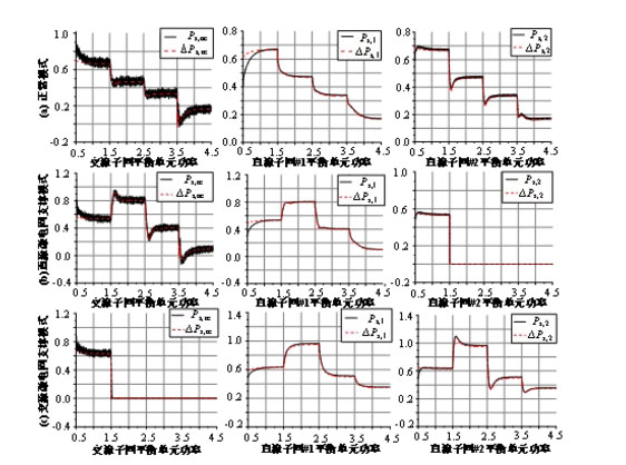 本文采用圖1(a)所示的交直流微電網(wǎng)集群結(jié)構(gòu),對(duì)本文所提出的控制策略進(jìn)行仿真驗(yàn)證并與小信號(hào)建模的結(jié)果(黑色曲線為電磁暫態(tài)仿真結(jié)果,紅色為小信號(hào)模型仿真結(jié)果)進(jìn)行比對(duì)。本文進(jìn)行了正常模式運(yùn)行、直流微電網(wǎng)支撐模式及交流微電網(wǎng)支撐模式三種工況下的仿真測試,并對(duì)比了詳細(xì)電磁暫態(tài)仿真及利用小信號(hào)模型所獲得的仿真結(jié)果(即圖中帶Δ標(biāo)識(shí)的電氣量仿真波形),三種工況下波形如下圖6所示,(a)、(b)、(c)對(duì)應(yīng)三種不同模式。從圖中可看出詳細(xì)電磁暫態(tài)和小信號(hào)模型仿真結(jié)果基本吻合,有效驗(yàn)證了小信號(hào)模型的準(zhǔn)確性;此外,通過多種工況仿真測試驗(yàn)證了本文方法在應(yīng)對(duì)正常大功率擾動(dòng)及運(yùn)行模式無縫切換等工況下的有效性。