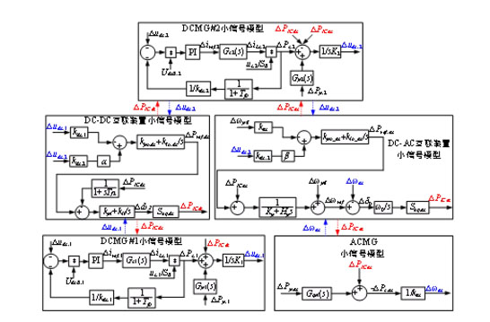 大功率波動(dòng)、運(yùn)行模式切換等暫態(tài)工況不僅容易對(duì)系統(tǒng)內(nèi)直流電壓、交流頻率等造成沖擊,且當(dāng)控制參數(shù)選擇不當(dāng)時(shí),還可能導(dǎo)致系統(tǒng)出現(xiàn)功率振蕩等穩(wěn)定性問題。為此,本文接下來將首先建立交直流微電網(wǎng)集群多運(yùn)行模式下的小信號(hào)穩(wěn)定性分析模型進(jìn)行穩(wěn)定性分析,為后續(xù)深入研究系統(tǒng)功率振蕩穩(wěn)定機(jī)理分析及控制器參數(shù)優(yōu)化設(shè)計(jì)提供基礎(chǔ)?;谀K化小信號(hào)建模思路,可得交直流微電網(wǎng)集群在正常運(yùn)行模式下的完整小信號(hào)穩(wěn)定性分析模型如下圖所示。