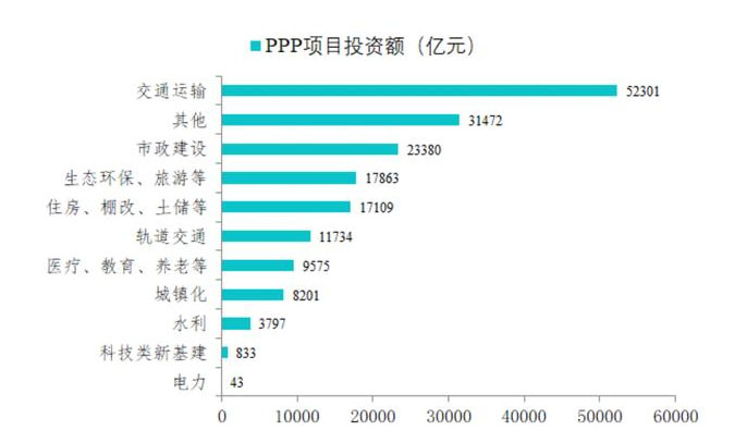再從2020年P(guān)PP項目的行業(yè)分布來看,“新基建”相關(guān)的軌道交通和科技行業(yè)合計規(guī)模1.3萬億元,其中軌道交通為1.2萬億元,科技類新基建為833億元,但新基建項目投資額占比僅為7%,相對來講并不高。
