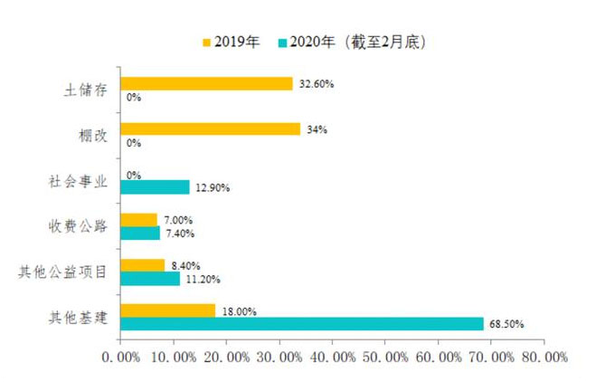 并且2019年9月國常會明確2020年提前下達地方政府新增專項債,不得投向棚改、土儲等項目。這使得2020年專項債投向基本都以基建為主,并未涉及土儲和棚改。