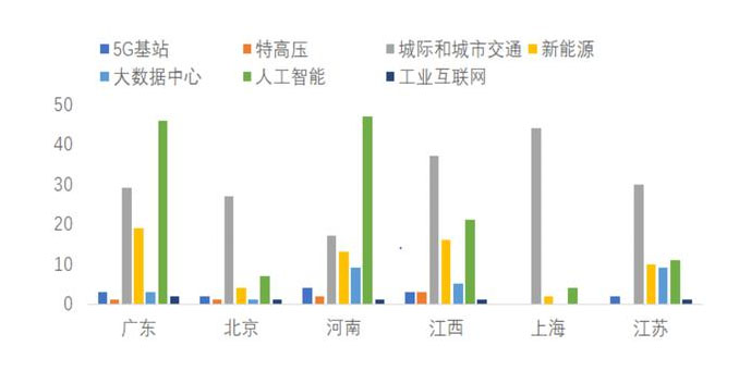 ▲圖7:六省、直轄市在七大領(lǐng)域的“新基建”項目數(shù)量