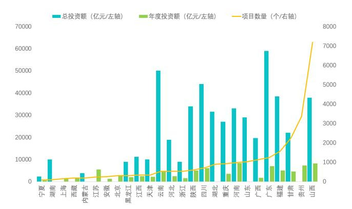 從項目數(shù)量來看,排在第一位的是山西,共發(fā)布了7181個重大項目,預(yù)計項目總投資37879億元,2020年年內(nèi)預(yù)計投資8151億元。