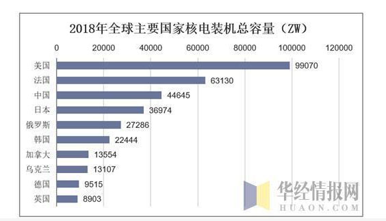 2019年,全球共有442臺核電機組可運行,凈裝機容量為392.4GWe,54臺機組在建。目前在運核電機組裝機容量排名前五的國家分別是美國、法國、中國、日本、俄羅斯,中國排名第三。根據(jù)國際原子能機構(gòu)及中國核能行業(yè)協(xié)會的統(tǒng)計,截至2018年12月31日,中國核能裝機容量位列全球第3位。