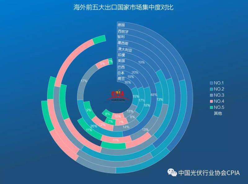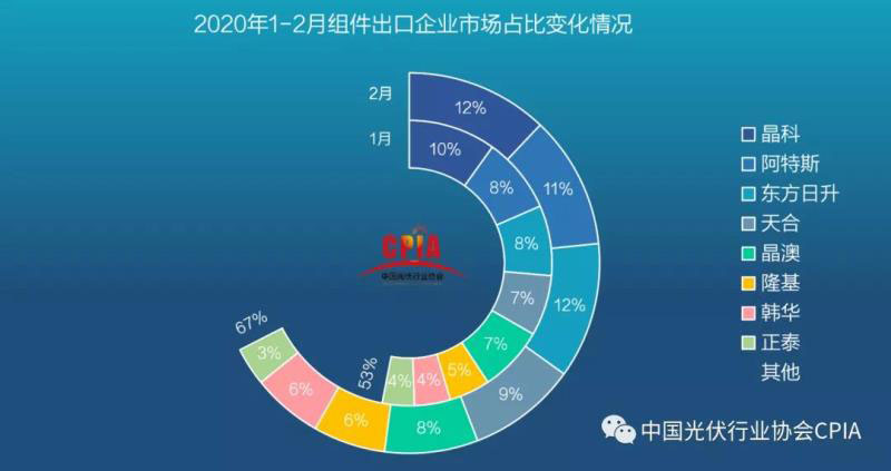 2020年1-2月,海外前五大和前十大組件出口市場占比分別為51%和73%,同比2019年分別下降了3.6個百分點與2.7個百分點(2019年1-2月TOP5-54.6%,TOP10-75.7%),海外市場繼續(xù)呈現多元化發(fā)展趨勢。