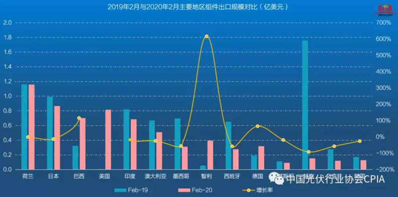 【智利】2月組件出口規(guī)模同比增長616.9%。作為可再生能源投資的熱土,憑借低廉的勞動力價格、豐富的光照資源(世界最好的輻照強度)以及良好的融資環(huán)境使光伏發(fā)電取得了巨大的優(yōu)勢。在智利的國家電力拍賣中,清潔能源可以利用價格優(yōu)勢擊敗化石能源,因此,智利政府提出了煤炭退役計劃,預計到2030年,太陽能將成為智利主要的電力來源,覆蓋超過30%的國內電力需求。此外,智利是第一個跟中國簽訂自由貿易協定的拉丁美洲國家,中國產品出口到智利97%沒有關稅,疊加該國有鼓勵光伏發(fā)展的政策,大大驅動了光伏在智利的快速發(fā)展。智利國家電力協調局表示2019年本國太陽能發(fā)電量7345GWh,占比9.4%,距離30%的目標相差較大,因此未來發(fā)展空間依舊很大。根據公開資料顯示,智利要求曾前往中國、西班牙、法國、意大利、韓國或伊朗的船舶,所有船員必須在離開上述國家后通過14天的隔離檢疫,才能進入智利。否則,他們不會收到港口的清關通知。如此看來,對于智利的影響主要還是來自港口清關等物流方面的影響。1-2月該地區(qū)組件市場出口額占比前五的企業(yè)分別為東方日升(39.7%)、東方環(huán)晟(20.0%)、天合(18.3%)、晶澳(15.7%)、正泰(3.3%)。