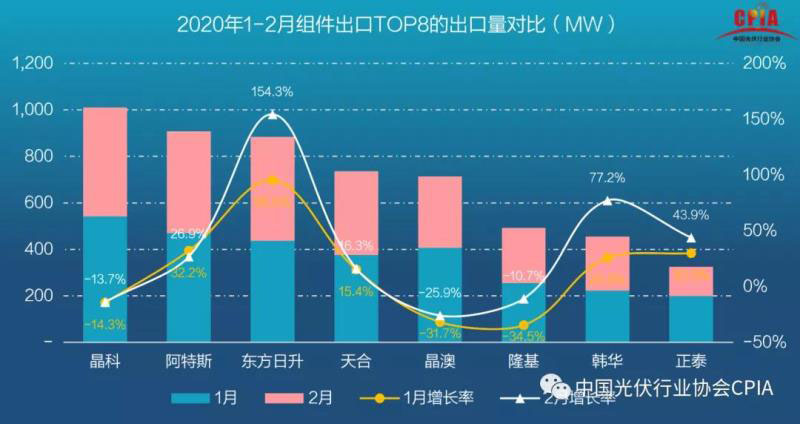 【日本】在2月的組件出口額同比下滑12.5%,1-2月國內有近800MW的組件出口至日本。日本FiT計劃自2012年推出以來,有大量存量項目沒有實現并網。2018年底日本政府要求2015年3月之間申請備案的項目要在2019年1月31日至2020年2月29日之前并網,否則將無法按當時的FIT獲得補貼。2016-2017年3月之前批準的待建項目會在2020年和2021年面臨類似的截止日期。在新政策的推動下,2020年日本市場面臨階段性搶裝,預計2020年的新增裝機規(guī)模會在7GW左右。之后隨著光伏補貼力度的持續(xù)縮減以及拍賣價格一再降低,土地、環(huán)評、限電、并網等諸多限制因素對地面電站的發(fā)展阻力將更為明顯,市場或將靠屋頂項目支持,容量回落至2-3GW左右。1-2月該地區(qū)組件市場出口額占比前五的企業(yè)分別為阿特斯(18.5%)、晶澳(16.5%)、韓華(8.4%)、晶科(7.5%)、京瓷(6.5%)。