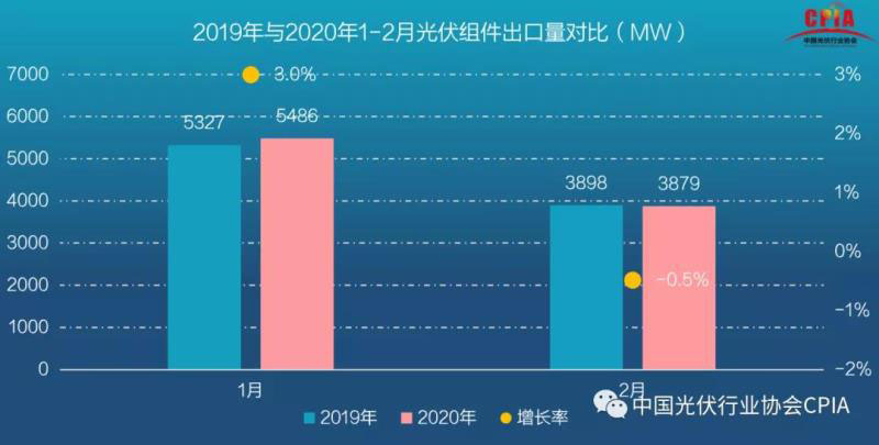 2020年1月組件出口規(guī)模5486MW,同比上升3.0%;2月組件出口規(guī)模3879MW,同比下降0.5%,總體來看1-2月組件出口規(guī)模同去年基本持平。但從出口增速環(huán)比情況來看,2019年2月組件出口3898MW,環(huán)比下降26.8%;2020年2月電池片出口3879MW,環(huán)比下降29.3%,相比2019年2月出口環(huán)比增速僅回落了2.5個百分點,較電池片環(huán)節(jié)回落幅度明顯偏小。疫情對2月組件出口的影響不是很強,隨著海外疫情的加劇,港口清關以及檢疫時間延長,疊加疫情嚴重地區(qū)可能會出現海外項目延期等因素,預計疫情的影響在3月的出口情況中會體現的更加明顯。