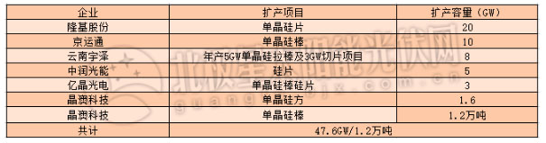 硅棒、硅片等共宣布擴產47.6GW,產能擴張的步子邁得最大是隆基和京運通,僅兩家擴產規(guī)模就占據擴產總量的63%,均以單晶為主。據中國光伏行業(yè)協(xié)會數據顯示,2018年單晶份額已達到45%,2019年單晶份額將進一步提升,并預計未來單晶將逐步完成對多晶的替代,正是看中這一發(fā)展趨勢,企業(yè)紛紛加碼單晶產線。