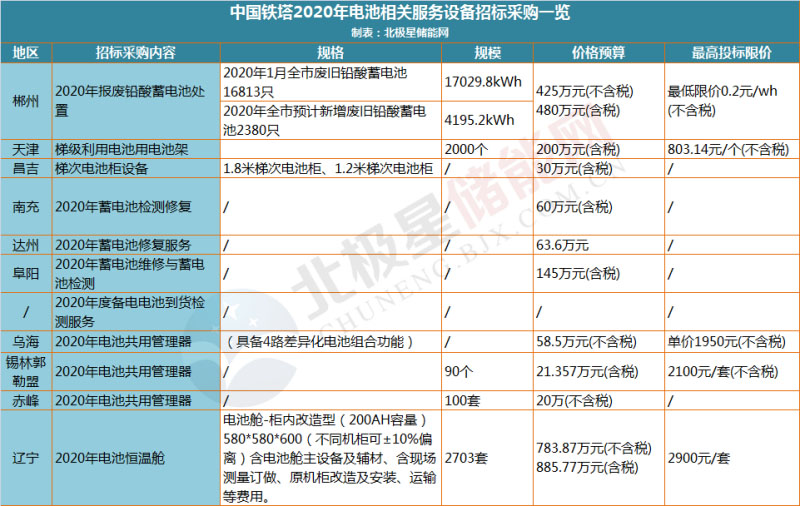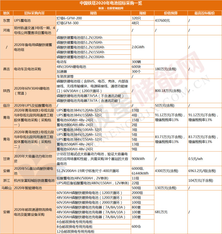 據(jù)北極星儲能網(wǎng)統(tǒng)計,中國鐵塔2020年以來已在20省市發(fā)布了24項(xiàng)招標(biāo),總預(yù)算超過8945萬元,多項(xiàng)招標(biāo)要求采購磷酸鐵鋰電池,還有部分招標(biāo)提及退役動力電池梯次利用。招標(biāo)需求詳情如下: