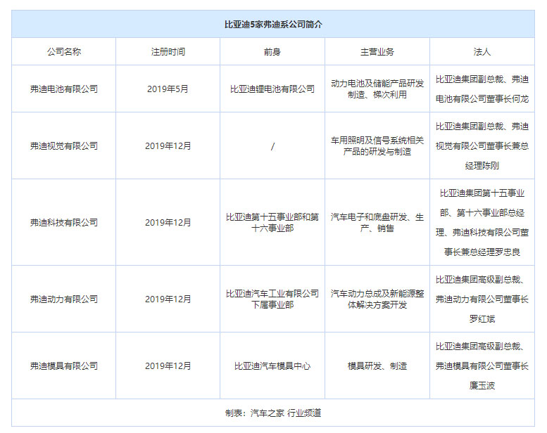 弗迪公司共有5家,分別是弗迪電池有限公司、弗迪視覺有限公司、弗迪科技有限公司、弗迪動力有限公司、弗迪模具有限公司。在比亞迪看來,弗迪系和比亞迪的關系,就像是行星和恒星的關系,弗迪系的每家公司是圍繞比亞迪新能源產(chǎn)業(yè)鏈優(yōu)勢而生的行星。