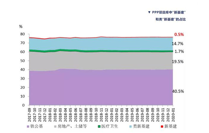 目前存量PPP項目總投資規(guī)模大概17.6萬億元,其中,傳統(tǒng)鐵公基(鐵路、公路、港口、碼頭、機場、隧道等)約7.1萬億元,約占41%。而狹義新基建項目在17多萬億PPP項目庫中,不足1000億元,占比只有0.5%,即便加上類新基建項目的2.6萬億,央視版“新基建”的投資規(guī)模也只有PPP項目庫的15%左右,約為傳統(tǒng)基建的四成。