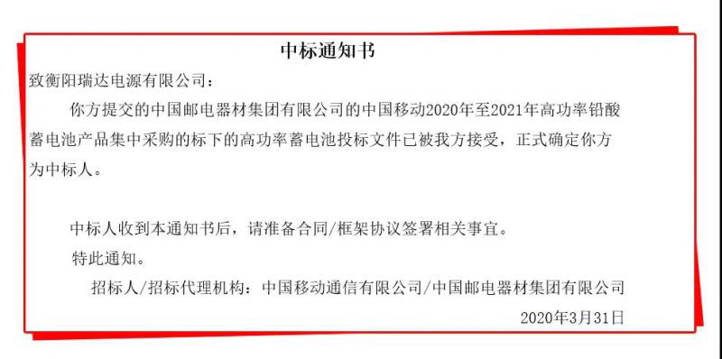 經(jīng)過移動(dòng)投標(biāo)項(xiàng)目組成員近三個(gè)月的努力,瑞達(dá)集團(tuán)在《中國移動(dòng)2020年—2021年高功率鉛酸蓄電池產(chǎn)品集中采購項(xiàng)目》成功中標(biāo),中標(biāo)份額13.04%,總金額約:5362萬元。