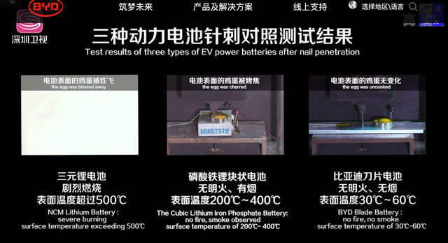 比亞迪在發(fā)布會當(dāng)天播放了磷酸鐵鋰刀片電池接受穿刺試驗的視頻,在同樣的測試條件下,三元鋰電池在針刺瞬間出現(xiàn)劇烈的溫度變化,表面溫度迅速超過500℃,并發(fā)生極端的熱失控——劇烈燃燒現(xiàn)象。而比亞迪“刀片電池”在穿透后無明火、無煙,電池表面的溫度僅有30-60℃左右。