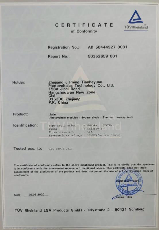 浙江佳明天和緣光伏科技有限公司副總經(jīng)理王福安表示道:“浙江佳明天和緣光伏科技有限公司始終致力于太陽能組件用接線盒、連接器及線纜的研發(fā)和制造,為客戶提供優(yōu)質(zhì)的產(chǎn)品和服務。此次通過TüV萊茵的二極管熱逃逸認證測試,再一次表明了佳明產(chǎn)品的質(zhì)量穩(wěn)定可靠,希望雙方加強合作,互利共贏,繼續(xù)推進太陽能光伏事業(yè)的健康、穩(wěn)定的發(fā)展”。
