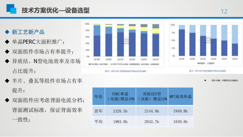 除容配比測算外,光伏系統(tǒng)設(shè)計方案優(yōu)化還應(yīng)盡可能采用先進設(shè)備高效組件進行降本以收益最優(yōu)進行競價方案測算,結(jié)合綠色設(shè)計與全生命周期考慮,并采用光伏+的方式,利用先進商業(yè)模式彌補項目的損失等。