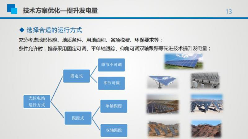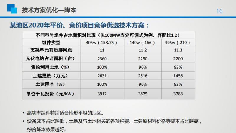 實際轉(zhuǎn)換效率才是真正提升發(fā)電量的指標,因此在先進技術(shù)選型上應(yīng)更多關(guān)注實際轉(zhuǎn)換效率。據(jù)惠星介紹,在降低度電成本方面,高功率組件特別適合地形平坦的地區(qū)。設(shè)備成本占比越低,土地及土地相關(guān)各項稅費,土建原材料價格、鋼材、水泥等成本占比越高,高功率組件的綜合降本效果越好。此外,在選擇支架合適的運行方式時,應(yīng)充分考慮項的目地形地貌、地質(zhì)條件、用地面積能否有效率用、各項稅費占比、環(huán)保要求是否嚴苛等。條件允許時,推薦采用固定可調(diào)、平單軸跟蹤、仰角可調(diào)雙軸跟蹤等先進技術(shù)提升發(fā)電量。
