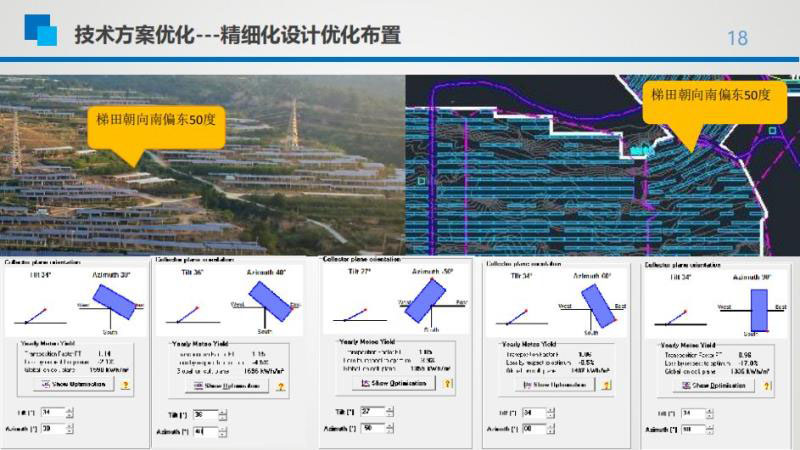 在精細化設(shè)計方面,惠星建議企業(yè)做方案時應(yīng)考慮精細,對于地形比較復雜地區(qū),包括對各個方位角的調(diào)整、損失輻射量比選、發(fā)電量比選都需進行綜合情況考慮。