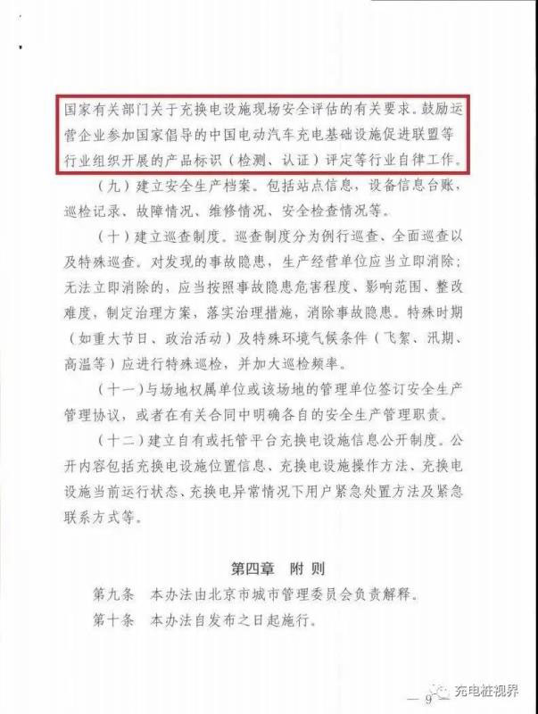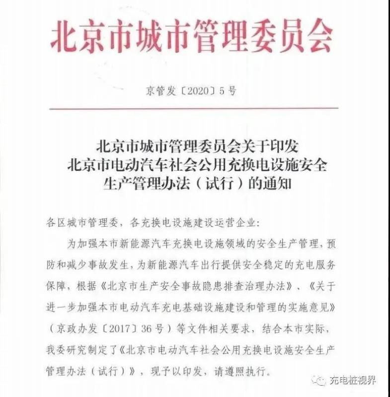 北京市城市管理委印發(fā)的《北京市電動(dòng)汽車社會(huì)公用充換電設(shè)施安全生產(chǎn)管理辦法(試行)》,規(guī)定將定期組織第三方專業(yè)機(jī)構(gòu)對(duì)本市行政區(qū)域內(nèi)的社會(huì)公用充換電場(chǎng)站進(jìn)行安全生產(chǎn)抽查,并建立充換電設(shè)施安全預(yù)警提示制度。