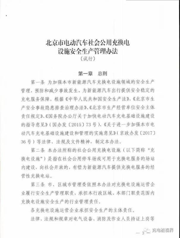 “安全生產(chǎn)是充電設(shè)施行業(yè)管理的重要組成部分,是電動(dòng)汽車用戶享受安全穩(wěn)定充電服務(wù)的重要保障。”市城市管理委相關(guān)負(fù)責(zé)人表示,考慮到本市還未出臺(tái)明確充換電設(shè)施安全生產(chǎn)管理職責(zé)的相關(guān)標(biāo)準(zhǔn)及政策文件,為進(jìn)一步落實(shí)市、區(qū)城市管理委及各充電設(shè)施運(yùn)營(yíng)企業(yè)的安全生產(chǎn)管理職責(zé)和主體責(zé)任,預(yù)防和減少事故發(fā)生,特制定《北京市電動(dòng)汽車社會(huì)公用充換電設(shè)施安全生產(chǎn)管理辦法(試行)》(以下簡(jiǎn)稱《辦法》)。