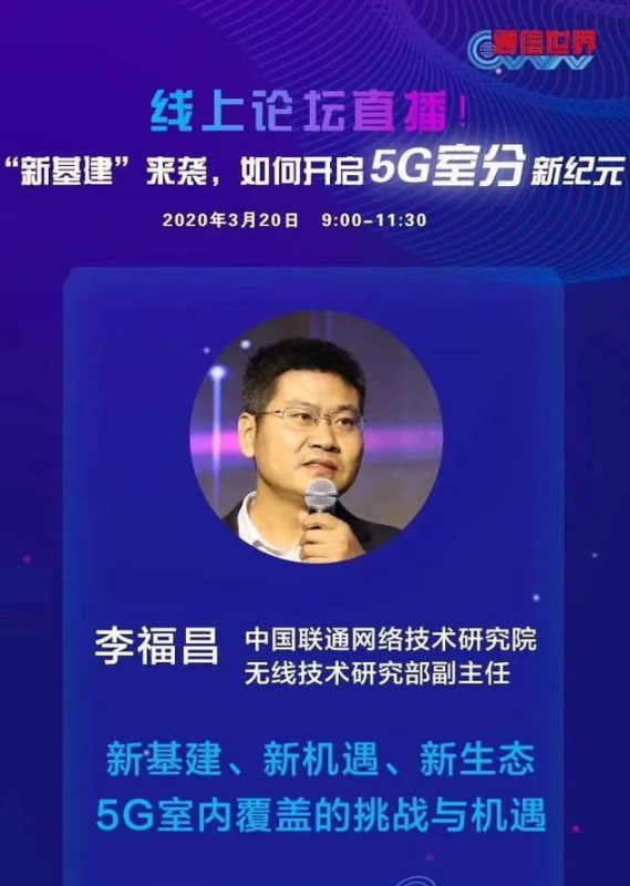 5G時(shí)代,將有超過(guò)85%的業(yè)務(wù)將發(fā)生在室內(nèi)場(chǎng)景,因此完善的5G室內(nèi)覆蓋顯得尤為重要。在此背景下,通信世界全媒體特策劃5G室分專題線上研討會(huì),中國(guó)聯(lián)通網(wǎng)絡(luò)技術(shù)研究院無(wú)線研究部副主任李福昌應(yīng)邀出席沙龍并分享了自己在5G室內(nèi)覆蓋領(lǐng)域的經(jīng)驗(yàn)和思考。在李福昌看來(lái),“新基建”給5G室分帶來(lái)了新的機(jī)遇,也為5G室分新生態(tài)提供了萌發(fā)的沃土。