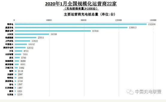 截至2020年1月,全國充電運營企業(yè)所運營充電樁數(shù)量超過1萬臺的共有8家,分別為:特來電運營15.2萬臺、星星充電運營13萬臺、國網(wǎng)運營8.8萬臺、云快充運營4萬臺、依威能源運營2.5萬臺、上汽安悅運營1.8萬臺、中國普天運營1.4萬臺、深圳車電網(wǎng)運營1.3萬臺。這8家運營商占總量的90.2%,其余的運營商占總量的9.8%。