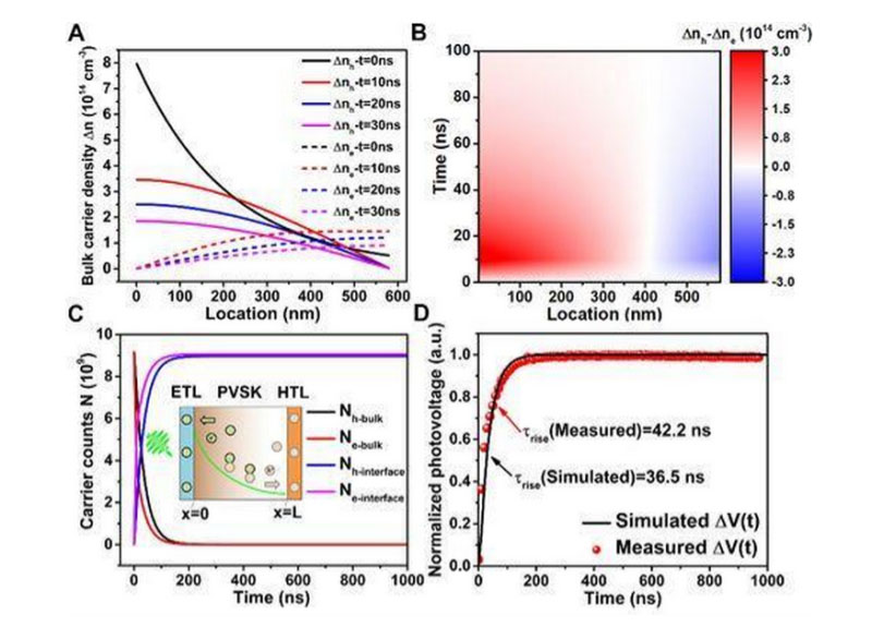 圖2. 鈣鈦礦吸收層中電荷傳輸?shù)哪M和光電壓的建立過程