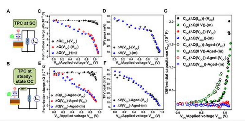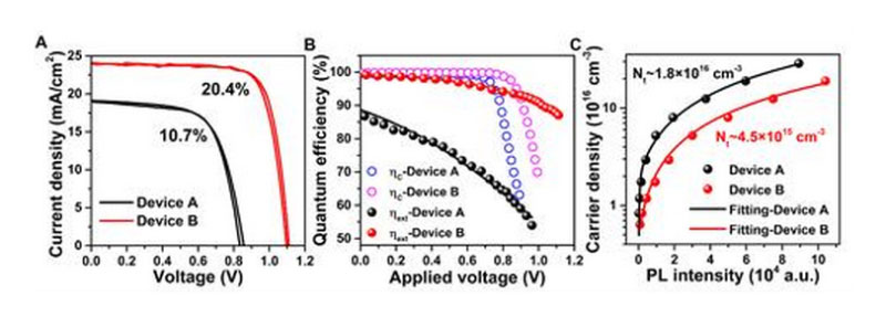 圖3. 鈣鈦礦太陽能電池中的電瞬態(tài)研究:Device A and B光電轉(zhuǎn)換效率 (A)量化電荷抽取和收集量子效率(B)以及鈣鈦礦吸收層中的缺陷態(tài)密度(C)。