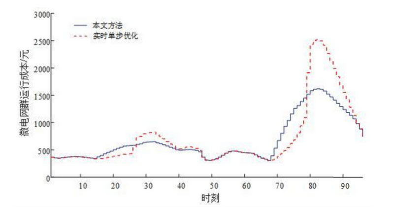 以一個由4個MG組成的微電網群為例,進行分析。圖2為分別采用本文方法和實時單步優(yōu)化策略時微電網群各個時刻的運行成本對比??梢钥闯?,兩種方法下的運行成本差異主要出現在第70至96個時刻,這段時間負荷功率處于較高的水平,MPC的每一步優(yōu)化都考慮了系統未來一段時間的狀態(tài),在負荷高峰期由柴油機和蓄電池同時供電,而單步優(yōu)化中先由蓄電池供電后由柴油機供電,可以有效避免柴油機高負荷運行,從而降低運行成本。統計24h內微電網群的總運行成本,采用MPC比采用單步優(yōu)化降低6.59%的運行費用。