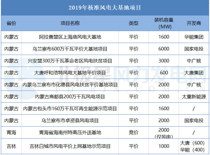 隨著“三北”棄風(fēng)率大幅下降以及部分省市風(fēng)電紅色預(yù)警的解除,2019年,風(fēng)電大基地又在各地如火如荼的展開,據(jù)北極星風(fēng)力發(fā)電網(wǎng)統(tǒng)計(jì),2019年僅內(nèi)蒙古一地就先后核準(zhǔn)了八個(gè)風(fēng)電大基地項(xiàng)目。