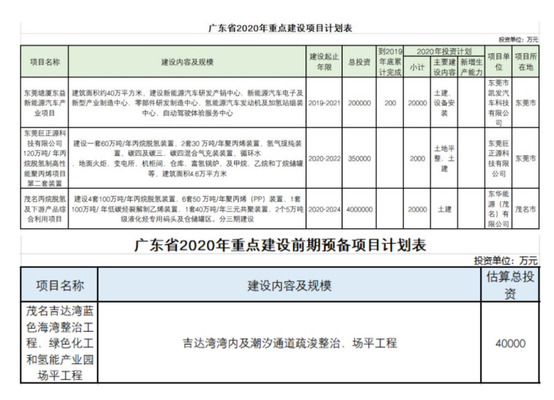 據廣東省發(fā)改委官網3月5日信息,《廣東省2020年重點建設項目計劃》正式發(fā)布,2020年廣東省共安排省重點項目1230個項目,總投資5.9萬億元,年度計劃投資7000億元,安排開展前期工作的省重點建設前期預備項目868個,估算總投資3.4萬億元。其中,共有4個氫能及燃料電池相關項目入圍。