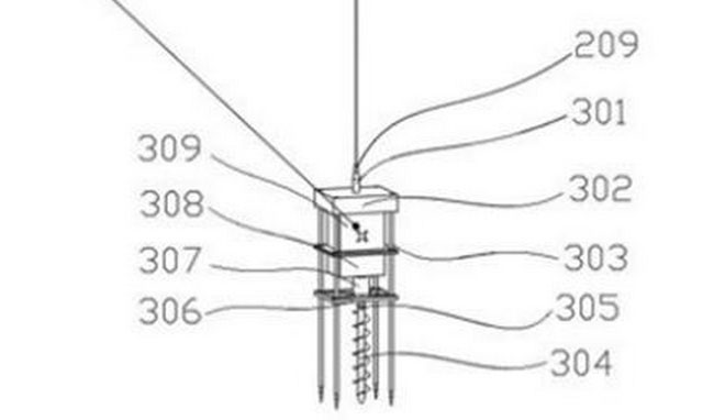 該裝置包括波浪能發(fā)電機(jī)構(gòu)、補(bǔ)償機(jī)構(gòu)、錨定機(jī)構(gòu)。波浪能發(fā)電機(jī)構(gòu)包括齒輪、直齒條、轉(zhuǎn)動(dòng)軸、棘輪、發(fā)電機(jī)、無線通訊模塊。補(bǔ)償機(jī)構(gòu)包括滾筒馬達(dá)、滾筒、深海纜繩。錨定機(jī)構(gòu)包括螺紋鉆桿、馬達(dá)、支撐桿。