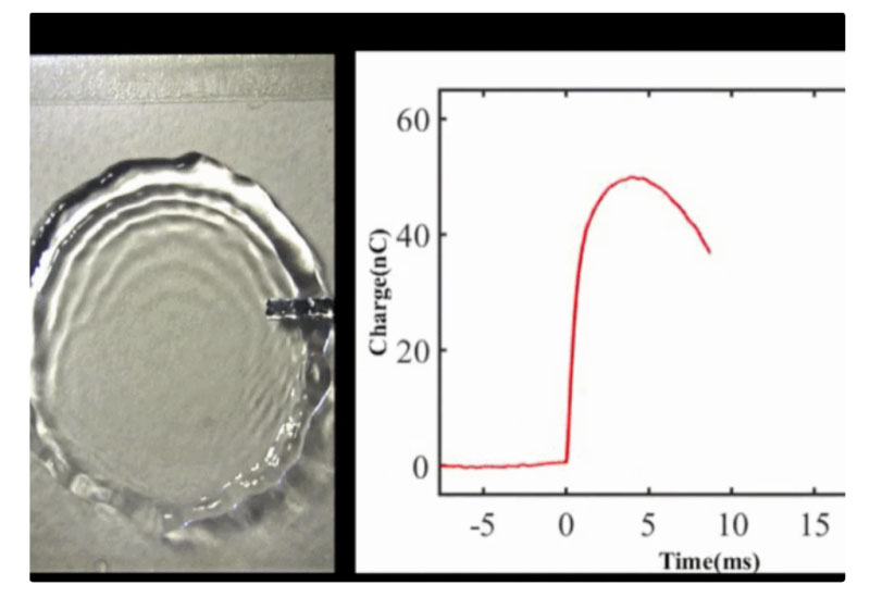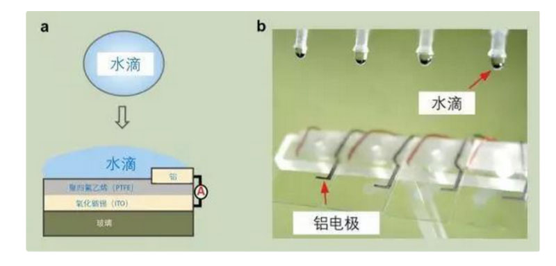但隨著 “砸” 在表面上的水滴鋪展開來,“奇跡”就出現(xiàn)了。隨著水滴的表面積越變越大,它逐漸擴(kuò)散到了鋁電極上。由于水滴也是導(dǎo)電的,它就在一個(gè)瞬間接通了之前本不相連的聚四氟乙烯、鋁電極和氧化銦錫電極,形成了一個(gè)連通的電路。在這個(gè)過程中,這水滴不只是發(fā)電系統(tǒng)的能量來源,更重要的是整個(gè)發(fā)電機(jī)的開關(guān)。