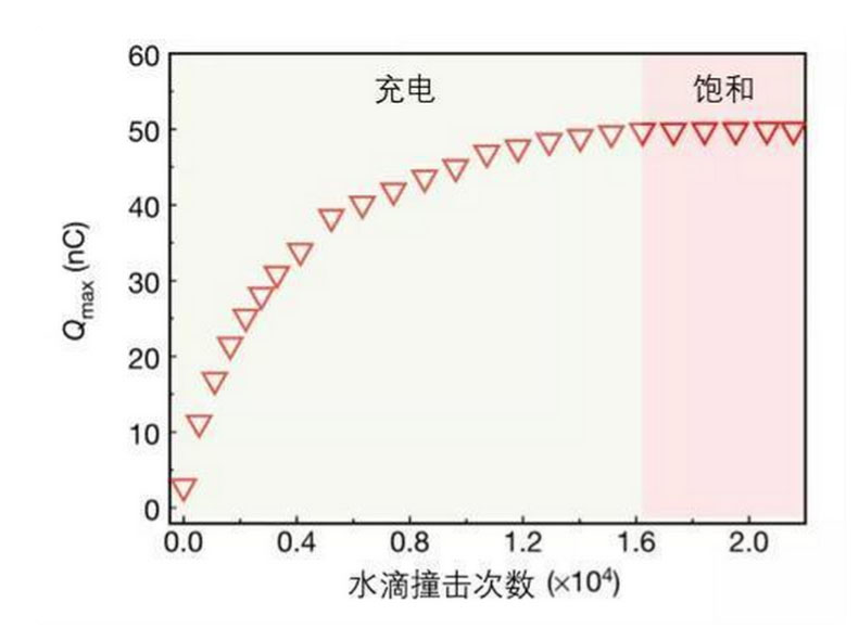 圖丨聚四氟乙烯表面電荷與水滴撞擊次數(shù)的關(guān)系。在 16000 次的撞擊后,電荷密度會達(dá)到飽和。(圖片來源:Xu et al., 2020)