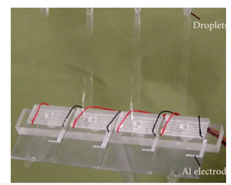 在聚四氟乙烯和氧化銦錫電極之外,他們還安裝了一個(gè)鋁電極。這樣一來,這個(gè)發(fā)電機(jī)就像半導(dǎo)體中的三極管一樣,擁有了三個(gè)電極。這第三個(gè)電極成為了提高水滴發(fā)電機(jī)功率的關(guān)鍵。