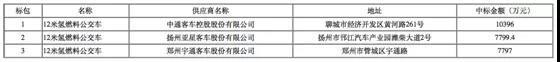 2020年1月19日,中通客車、亞星客車、宇通客車中標(biāo)濰坊市公共交通總公司100臺新能源公交項(xiàng)目,均為12米氫燃料公交車,中標(biāo)金額分別為10396萬元、7799.4萬元、7797萬元,總金額近2.6億元,每臺單價約259.92萬元。