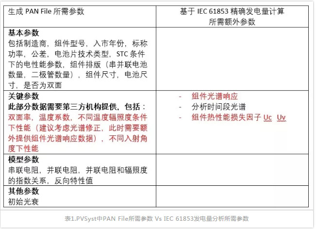 表1.PVSyst中PAN File所需參數(shù) Vs IEC 61853發(fā)電量分析所需參數(shù)