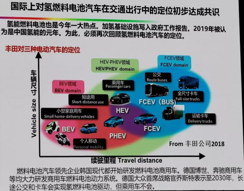 最后說一下氫能燃料電池。關(guān)于氫能燃料電池的基本定位,國際基本達(dá)成共識。大家都知道氫能今年是熱點(diǎn),很多人說今年是氫能燃料電池的元年。為此我們必須回顧氫燃料電池的定位。這是燃料電池領(lǐng)先企業(yè)豐田給出的定位。燃料電池就是在這個(gè)區(qū)域。