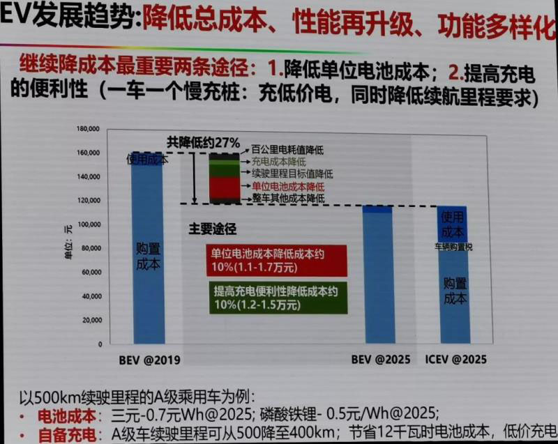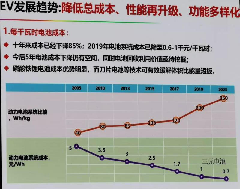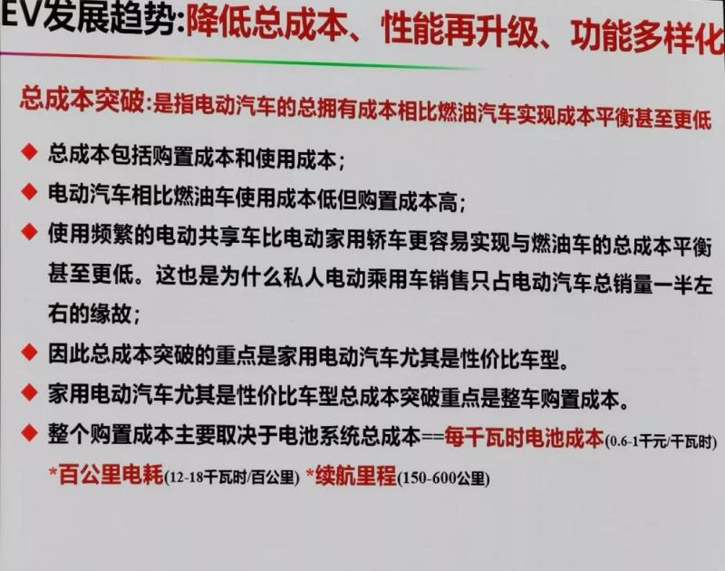 今年我們技術(shù)領(lǐng)先的兩家企業(yè)不約而同的在這方面做出了創(chuàng)新。針對比能量提升方面,發(fā)布了電池包的新技術(shù)-寧德時(shí)代CTP和比亞迪的刀片電池。新概念,這是我要重點(diǎn)強(qiáng)調(diào)的。其他的就不說了。下一步的趨勢,我的概括是降低總成本、性能再升級、功能多樣化。來看純電動車發(fā)展趨勢,首先總成本必須突破??偝杀局傅氖请妱悠嚳倱碛谐杀鞠啾热加推噷?shí)現(xiàn)成本平衡甚至更低??偝杀景ㄙ徶贸杀竞褪褂贸杀荆蠹叶贾朗褂贸杀臼堑偷?,但購置成本是高的。