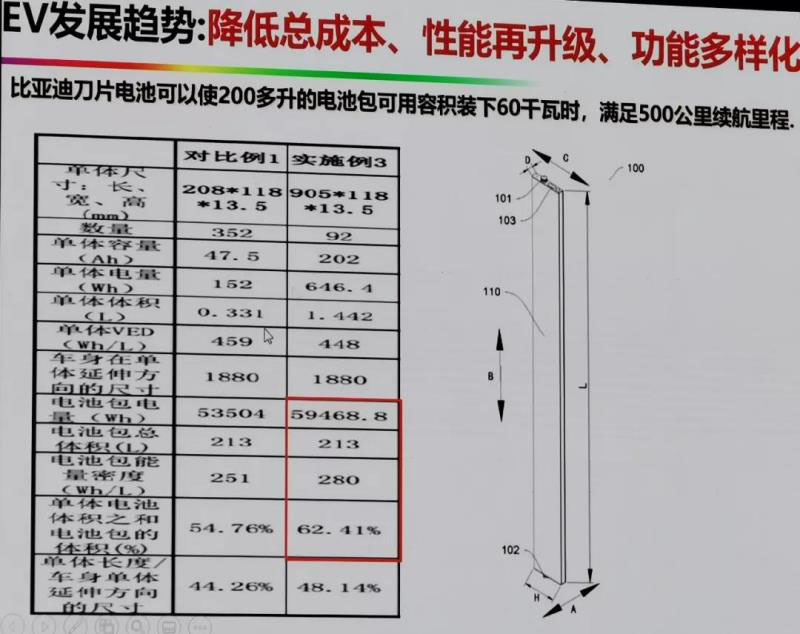 現(xiàn)在我們的電池系統(tǒng)成本已經(jīng)在0.6~1元/kW·h。當(dāng)然,1元/kW·h就是三元電池的,低的是磷酸鐵鋰電池。今后五年電池成本下降仍有空間。比如三元電池到2025年之前到七毛錢一個(gè)瓦時(shí),磷酸鐵鋰還有下降空間。但我們同時(shí)要強(qiáng)調(diào),電池回收利用價(jià)值要亟待挖掘。這方面,我想磷酸鐵鋰電池成本優(yōu)勢是非常明顯的,而刀片電池等技術(shù)可以有效的緩解以前磷酸鐵鋰電池體積比能量的短板。待會王傳??倳榻B。這就是刀片電池,對于一個(gè)200L,就是A0級車型的體積,它可以裝到接近60度電,基本可以解決續(xù)航里程的問題。