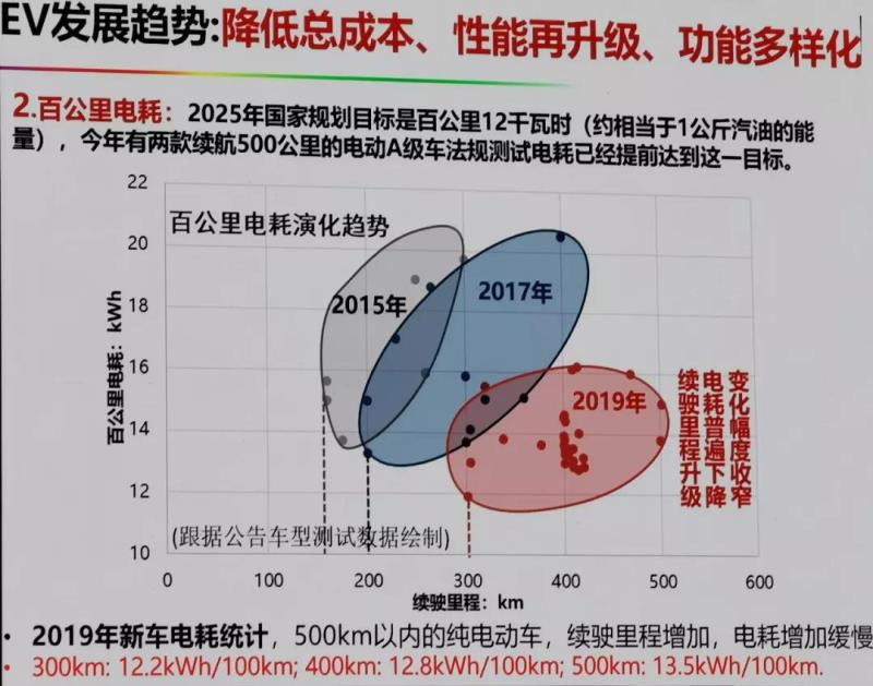 第二個(gè)是百公里電耗。前面其實(shí)萬主席已經(jīng)講過百公里電耗。這是我們統(tǒng)計(jì)工信部的數(shù)據(jù),不是實(shí)際電耗,是工信部發(fā)布的。從國家檢測的電耗可以看出,2015年、2017年到2019年,續(xù)駛里程在升級,在這個(gè)軸上。電耗普遍下降,而且變化的幅度在收窄。不管300公里到500公里這個(gè)變化范圍,它都收窄。這是個(gè)好東西,比如說我們今年有兩款500公里的電動轎車,工信部電耗在12度電/百公里。
