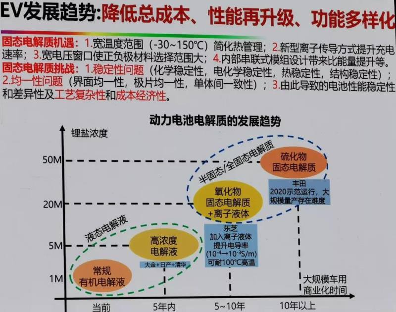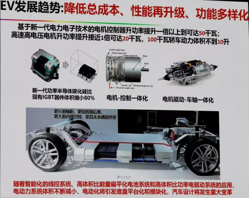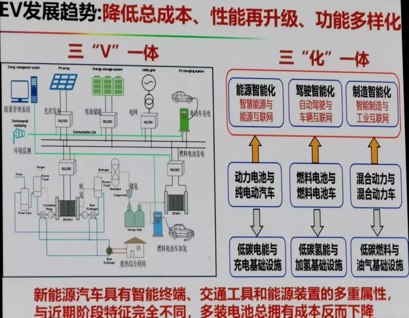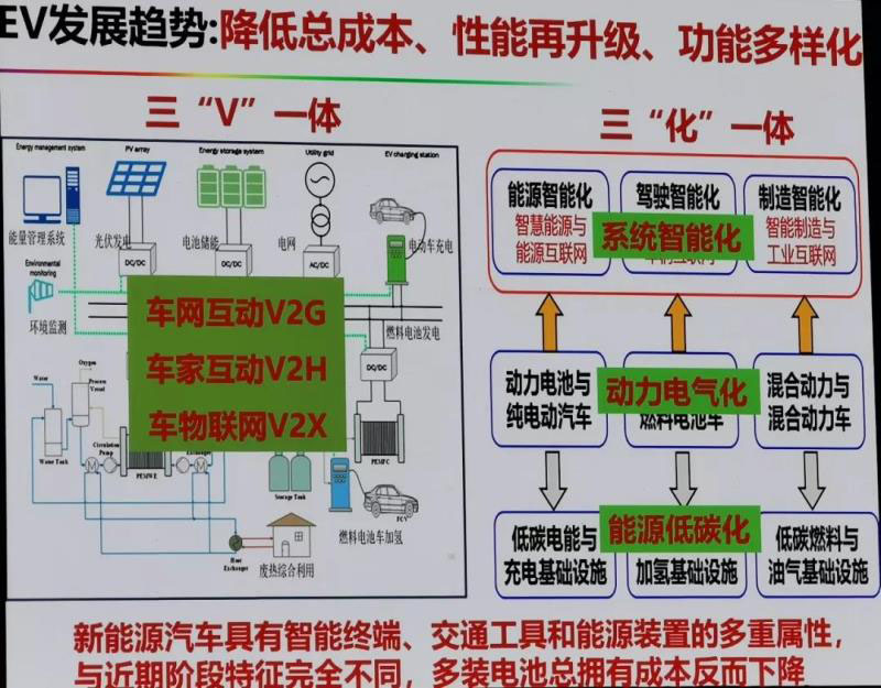 所以性價(jià)比拐點(diǎn)到達(dá)的時(shí)間順序是不一樣的。續(xù)駛里程越短,越容易先到。所以并不是都要2025年才能到,有些提前就到了。如果你還裝低電池成本,那到的更快,這沒辦法做一個(gè)統(tǒng)一的標(biāo)準(zhǔn)。我們說的2025年是指普遍。繼續(xù)降低成本最重要的途徑就是,第一降低單位電池成本。第二,提高充電的便利性。提高充電便利性之后,客戶對里程的需求就會降低。他會從500降到400,如果家里或者單位有一個(gè)充電樁,就會解決大問題。下一步就是性能再升級。兩個(gè)方面,一個(gè)是新一代電力電池。這會使下面的電驅(qū)動一體化,然后呈現(xiàn)這種扁平化的汽車底盤。大家去看電動車,只要打開,基本上是空的,如果是混合動力全都是滿的,下一步還會繼續(xù)空下去,這是通俗的講法。第二個(gè)性能再升級,當(dāng)然就是電解質(zhì)的技術(shù)進(jìn)步。由于時(shí)間關(guān)系,我在這兒不詳細(xì)介紹,因?yàn)檫@一張圖我可以講十分鐘。第三個(gè)就是功能多樣化,我們叫三“V”一體,就是V2G、V2H、V2X。V2H現(xiàn)在也開始了,就是建筑跟車輛電氣系統(tǒng)一體化。