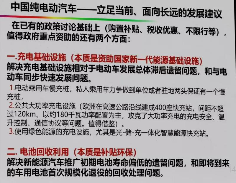 另外就是三“化”一體,我們現(xiàn)在除了電動化,還有能源的低碳化和系統(tǒng)智能化。所以新能源汽車具有智能終端交通工具能源裝置的多重屬性。如果到功能多樣化階段的時(shí)候,也許客戶他反而需要讓你給他裝多一點(diǎn)電池。這樣總成本反而能降低,因?yàn)樗梢杂秒姵刈鳛閮δ?,給電網(wǎng)放電,獲取收益。所以立足當(dāng)前面向長遠(yuǎn)的一個(gè)建議。前面苗部長已經(jīng)都說了,我們希望購置補(bǔ)貼啊,稅收優(yōu)惠呀,不限行等等。我提請政府重點(diǎn)資助還有兩個(gè)方面,一個(gè)就是充電基礎(chǔ)設(shè)施。其實(shí)充電基礎(chǔ)設(shè)施的本質(zhì)是資助國家新一代能源基礎(chǔ)設(shè)施。這個(gè)我不具體介紹。還有一個(gè)電池回收利用,本質(zhì)是是資助補(bǔ)貼環(huán)保,這個(gè)是有道德制高點(diǎn)的。