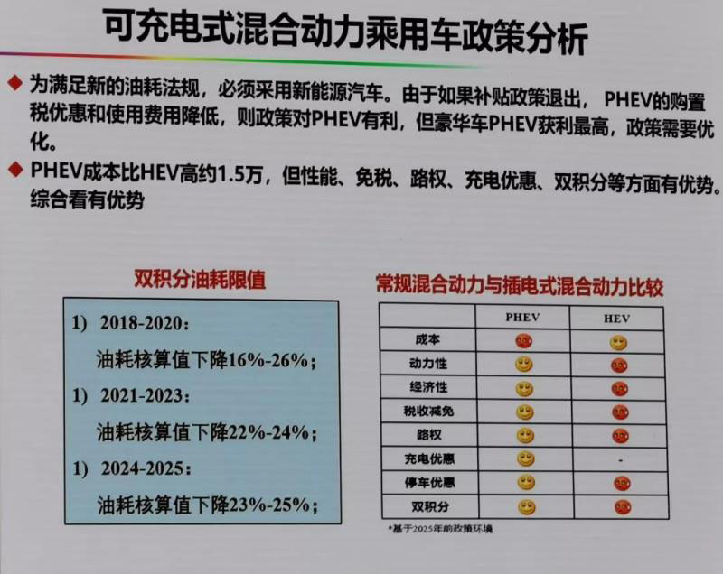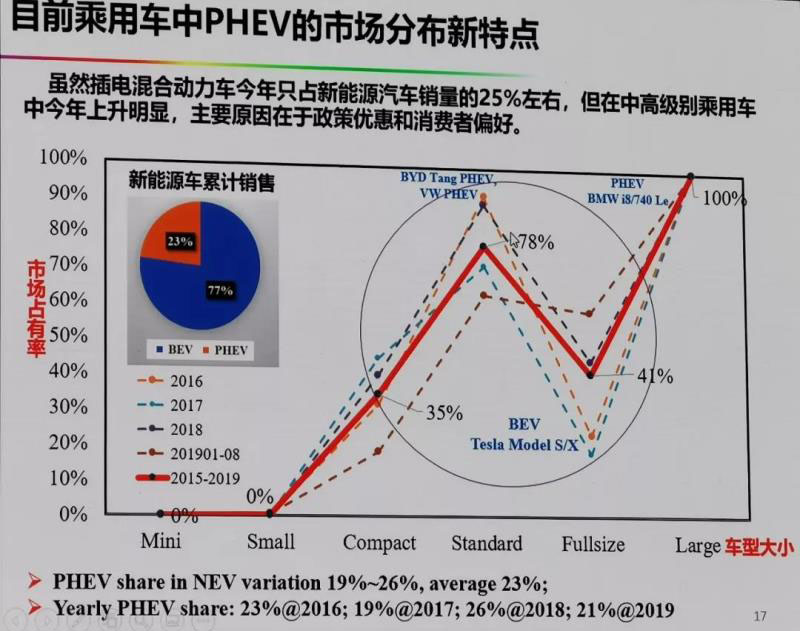 第二方面關(guān)于插混。中國特色的可充電式混合動力跟國外的可充電混合動力不一樣,我們叫純電型插混。所謂純電型插混,是在電池SOC滿的時(shí)候,到降低了30%之前,它就是純電動。國外的插電,不完全是這個(gè)概念,就是底下的混合型插電。也就是說,有電的時(shí)候,發(fā)動機(jī)也是能起來的,中國是不允許的,50公里是低限。其實(shí)現(xiàn)在大家知道,寶馬也在賣100公里的,我相信今后100公里、150公里都會有。至于電量下降之后進(jìn)入混合動力,其實(shí)就是和常規(guī)下的混合動力一樣。你可以是并聯(lián),可以是串聯(lián),可以是混聯(lián),都可以。這就是中國的插電混合動力。當(dāng)你是串聯(lián)的時(shí)候,我們就叫增程。今年有個(gè)特點(diǎn),就是在這個(gè)中間,二三十萬,20萬到50萬期間的這個(gè)插混賣的比價(jià)好。我們分析了一下原因,首先是政策,使它相對于常規(guī)混合動力有市場競爭力,這里不詳細(xì)介紹。市場方面,對客戶來講,也有很好的安全性、性價(jià)比、便利性、車輛殘值等等。相比純電動和常規(guī)混合動力,他也有優(yōu)勢。