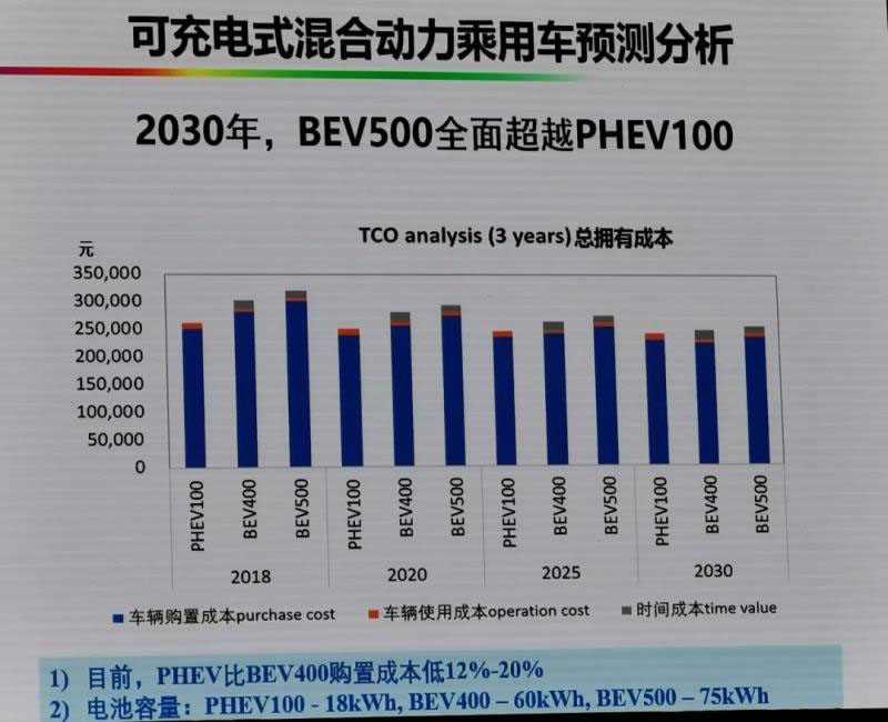 邏輯,我就不細(xì)講了。但是我們叫學(xué)生預(yù)測一下,分析到2030年500公里的純電動跟100公里純電里程的插電混動比,純電動的總擁有成本會跟她打平,甚至比它還好,這是一個(gè)未來趨勢。所以我們認(rèn)為,可充電式混合動力會先上,而后會逐步下,2025年左右會到高峰。到2030年,剛才我說的那個(gè)功能多樣化就上來了,客戶反而多用電池。因?yàn)槟莻€(gè)時(shí)候保有量已經(jīng)很大了,V2G也會上來。那么我在這里要特別做一下技術(shù)方面的介紹,就是混合動力的邏輯。