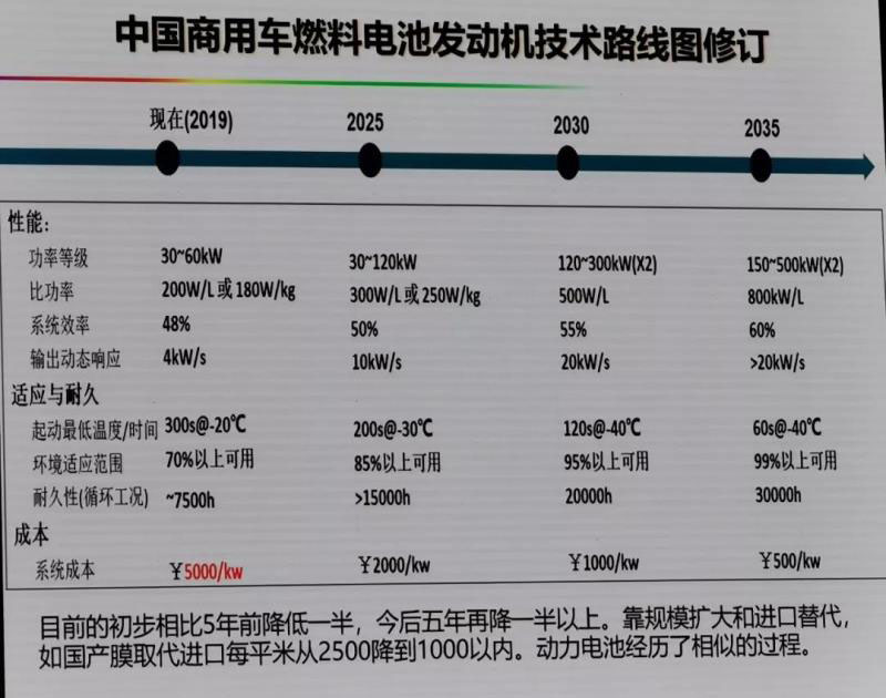 中國已經(jīng)在燃料電池商用車居世界前列。我們2018年是4000輛,現(xiàn)在5000輛。今后五年成本還會降低一半以上。為什么降?降的邏輯是什么?就是從進(jìn)口變成自己的。比方說膜,進(jìn)口很貴的。國產(chǎn)之后,我們現(xiàn)在山東東岳的膜已經(jīng)可以用了。所以這是很重要的一個(gè)原因。當(dāng)然還有一個(gè)規(guī)模擴(kuò)大的原因。這是中國燃料電池的技術(shù)路線圖。