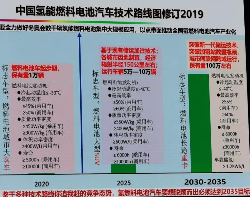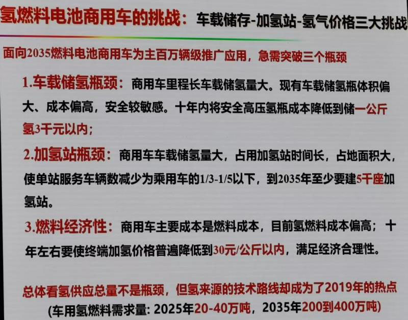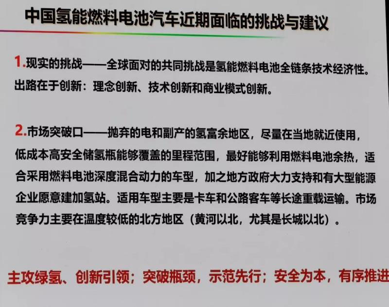 那么下一步重點(diǎn)就是奧運(yùn)會。冬奧會幾千輛燃料電池車,就明年一年,我們要建二三十個(gè)加氫站和幾千輛車,這是現(xiàn)在最重要的。如果這一仗打的好,后面就順了。底下我加了一句,基于多種技術(shù)路線你追我趕的競爭態(tài)勢,氫燃料電池汽車如要想脫穎而出,必須在2035年達(dá)到我說的這個(gè)百萬輛目標(biāo)。如果到2035年,我們達(dá)不到這個(gè)目標(biāo),這是有風(fēng)險(xiǎn)的。