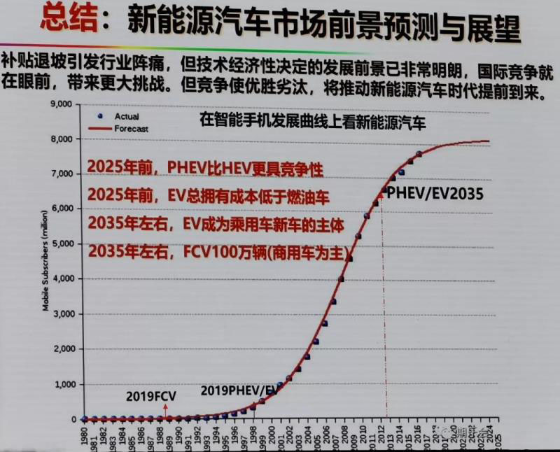 新能源汽車市場前景方面,補(bǔ)貼退坡引發(fā)了行業(yè)陣痛,但是技術(shù)經(jīng)濟(jì)性決定的發(fā)展前景已經(jīng)非常明朗。國際競爭就在眼前,帶來很大挑戰(zhàn)。但是競爭是優(yōu)勝劣汰,將推動新能源汽車時(shí)代早日到來。這是我對未來的預(yù)期,如果把新能源汽車放在這個(gè)手機(jī)發(fā)展的這條線上來看,這是個(gè)S曲線,智能手機(jī)的發(fā)展曲線。我們現(xiàn)在新能源汽車大概相當(dāng)20年前的智能手機(jī)。馬上就要進(jìn)入這個(gè)地方,到2035年基本開始快速上升。這幾條我就不念了。2035年新能源汽車規(guī)劃說的就是成為乘用車新車的主體,這個(gè)不是說的新能源汽車的主體,是整個(gè)乘用車新車的主體。謝謝各位。