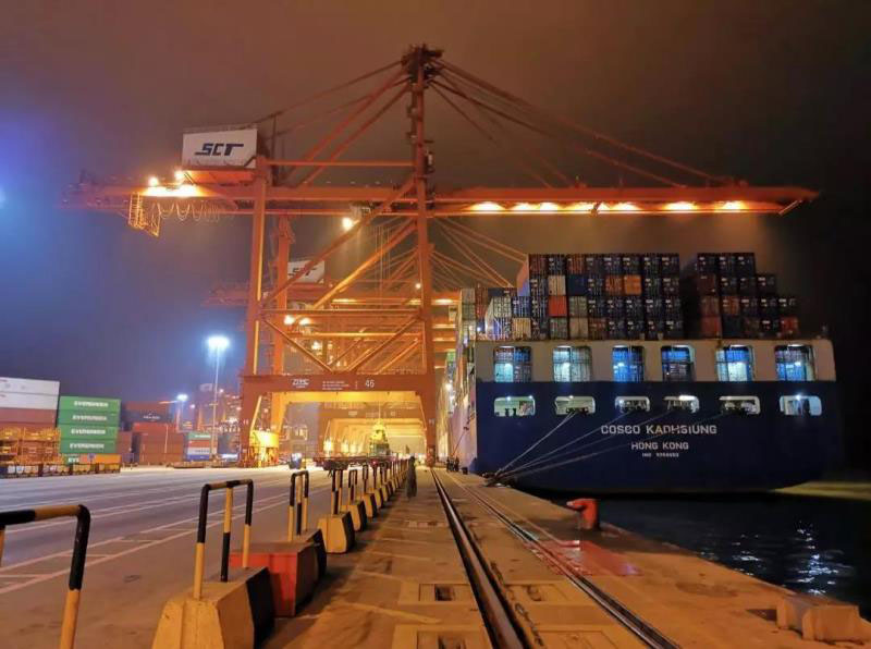 此次接電成功的“中遠高雄”號貨輪是我國自行研制生產(chǎn)的第一批萬箱船,也是亞洲最大、世界第三大新一代萬箱船,船長348.5米,寬45.6米,高65.7米,總重11.6萬噸,裝載量達11.2萬噸。