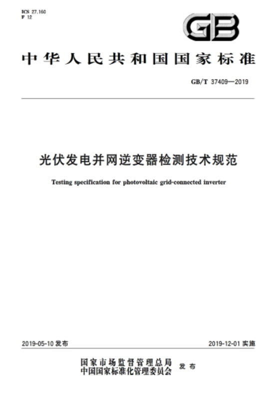 中國儲能網(wǎng)訊:日前,國家市場監(jiān)督管理總局、中國國家標(biāo)準(zhǔn)化管理委員會發(fā)布了光伏行業(yè)標(biāo)準(zhǔn)《光伏發(fā)電并網(wǎng)逆變器檢測技術(shù)規(guī)范》,標(biāo)準(zhǔn)號:GB/T 37409-2019,該標(biāo)準(zhǔn)2019年12月1日開始實施。